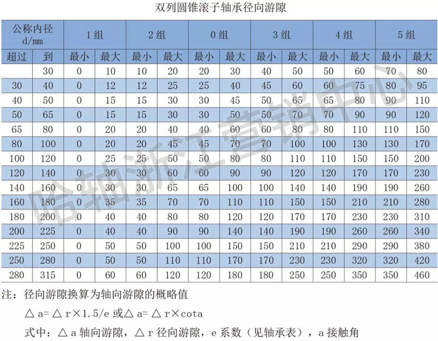 單列圓錐滾子軸承制造安裝后才有內(nèi)部游隙,并在另一個以相反方向定位的軸承進行調(diào)節(jié)后才能確定。雙列圓錐滾子軸承徑向游隙按下表執(zhí)行。